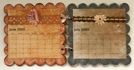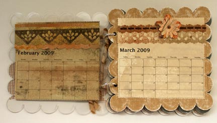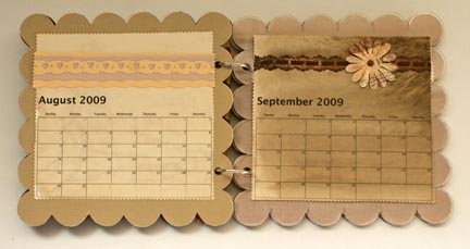 Here is a 2009 calendar I created using 2 different albums by Clear Scraps: The Scalloped Square Acrylic Album plus the Square Scalloped Chipboard Album. I also used Thickers by American Crafts, Cardstock by Core'dinations, Zip Dry paper glue, Magic Mesh, Glue Dots, journal spots by Jenni Bowlin, plus some other supplies. If you'd like to see a complete supply list plus step by step instructions for how to create this calendar, please click here to visit the project page for this 2009 clear and chipboard scalloped calendar album.
