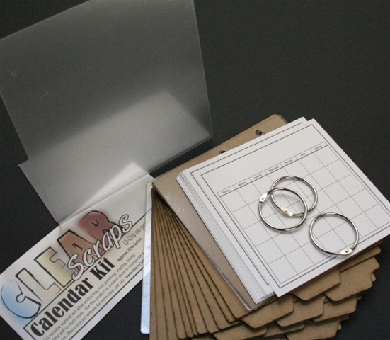 If you don't already have a clear album in your stash, might I suggest a Clear Scraps Calendar Kit? It's a no-brainer to use this kit, since Clear Scraps has already done a lot of the work for you- with this kit, you can skip the step of locating / downloading / printing / designing / stamping / assembling a calendar, and get right to the fun part, which is designing and embellishing the pages. (This kit also makes a great gift!) The kit has everything you need except adhesive, papers and embellishments.