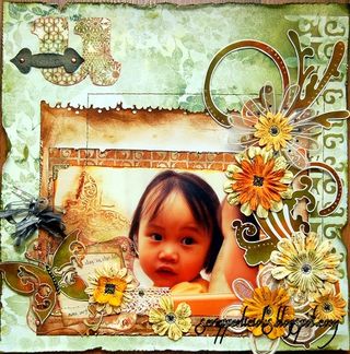 An easier or alternative way to doing it would be to simply get yourself a metallic acrylic paint dabber. For example, as per my layout about, I've inked an acrylic deco frame from Clear Scraps with some copper paint dabber. Why paint dabber? The texture on the dispenser (sponge) would create a rustic look to your pieces instantly. If you don't have a paint dabber, try using some sea sponges or uneven sponges.