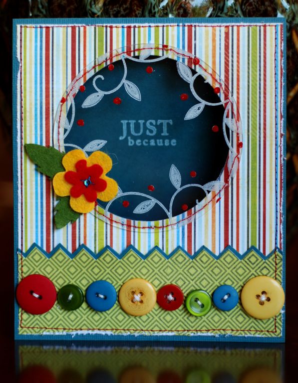 The first was made using the centers of the Clear Scraps flower shapes. I stamped on the circle with white Staz On ink and then used a ZIG paint pen for the red berries. I adhered it to the card by using my machine and sewing it to the card around the edges, another nice feature about Clear Scraps acyrilic…it can be easily sewn through!