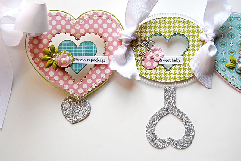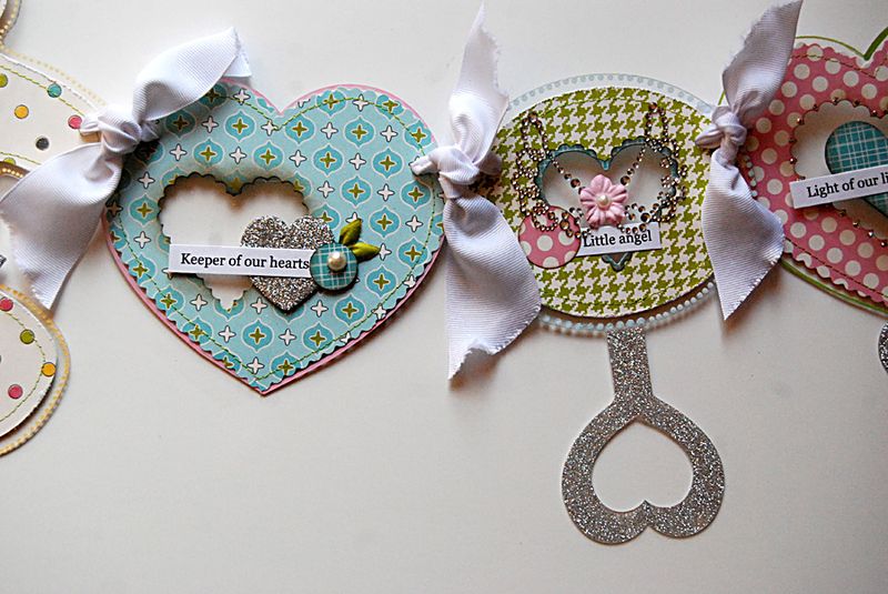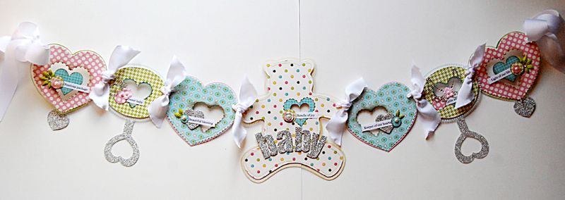 I'm wrapping up a few last minute things before I head off to CHA. I have some brand new Clear Scraps product for you to see. This is our brand new Baby banner. It was so much fun to create and sort of makes me want a little one again. I'd love to use this in a nursery for wall decor. This banner consists of the central bear shape, two rattle shapes, and four heart shapes.