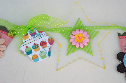 I used a pages from the Clear Scraps cupcake mini album as a template for tracing around the Junkitz cupcake paper, and then I added both the cupcake shapes and the cut-out papers to the banner. The smaller cupcakes aren’t ordinarily part of the banner, but I wanted to make my banner a little longer so I added them.