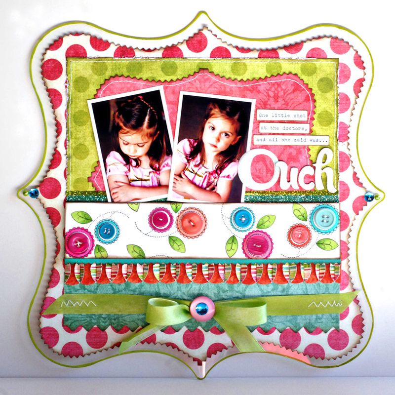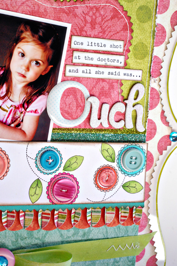 Then traced the shape onto the polka dot paper and cut out inside of my lines with my pinking shears, inked up the edges and applied it to the Clear Scraps page. Measured out the green polka dot page and the turquoise paper behind the ribbon and applied those. Put my photos on next. Next, I cut out all of the circles for that fun border, fold the side edges of the circles up and line them all up. Creates a really fun dimensional border that shows of both sides of the paper. Now the white card stock page I created on my own using floral stamps, Copic markers, Spica markers and buttons. Adhered that slightly over lapping the circle border and popped it up a bit with pop dots. Used Scor-Tape for the strips of glitter. Sewed down my ribbon (yes through the Clear Scraps, it works great!) TIed my bow and embellished with a button and rhinestone. Added my journaling and Thickers title and there you have it. Something to make the days around here brighter!