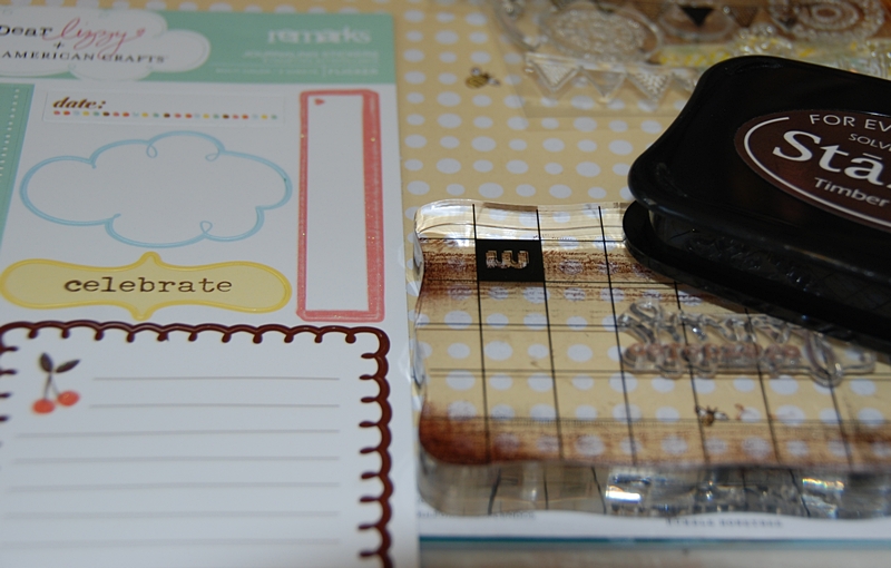 11. I used a Dear Lizzy stamp and only inked the "celebrate" portion and stamped it on one of the stickers from her line. This is the title of my album and I may go back and say Easter on the cover as well.