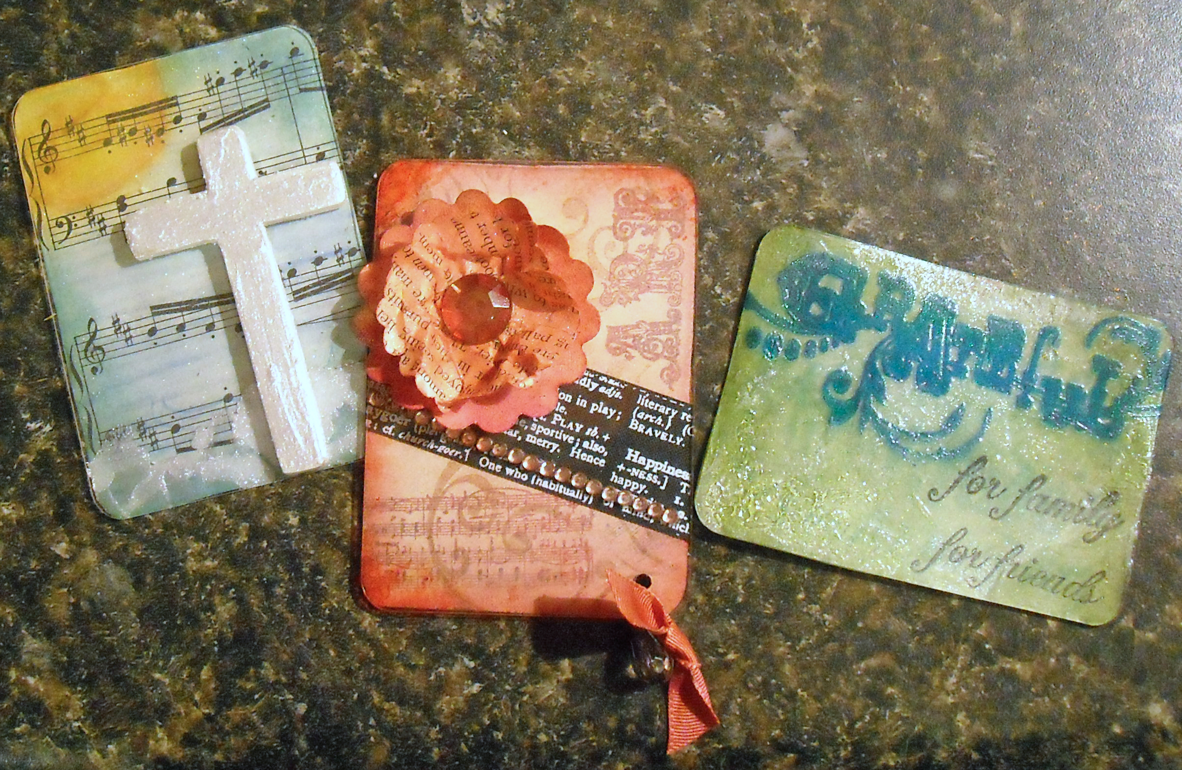 You can see that this is a small simple size, a great way to try something new! For these cards I was trying to tell about myself without using words.For the first card you can tell that I love music, and I believe in God. On the the next card you can see that I love the color orange and vintage like items. I also love words and reading. The third one seems self explanitory but if you look closely you will see that the surface has been change, some areas are rough and some are smooth, it represents that I have changed because if the family and friends I have and for that I am truly grateful.