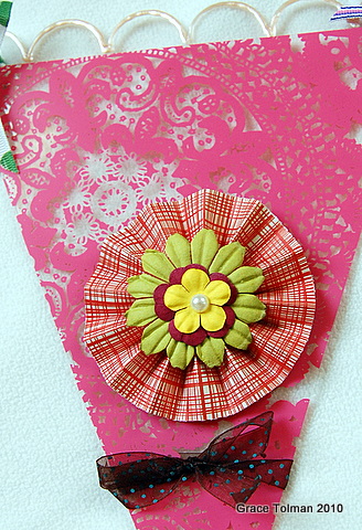 I then added some handmade paper flowers from Cosmo Cricket and finished it off with words to spell out party, flowers from Accent Creative Designs and ribbons plus pearls from my stash.