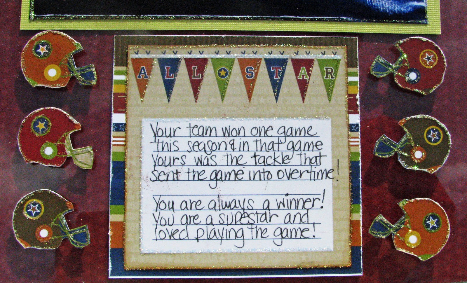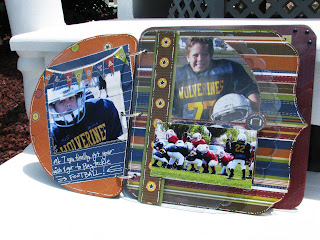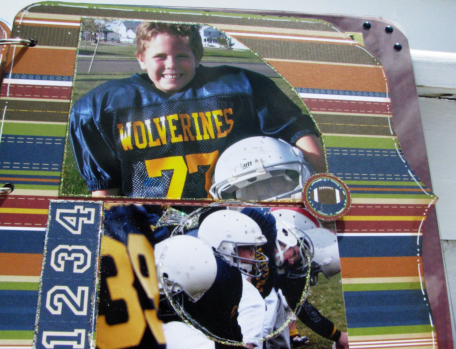 All of the papers and embellishments are from Ta Da Creative Studios ! The collection is called "Jock Jams".  This  album is perfect for a theme album – like football! LOL! Or maybe halloween pics throught the years or things I am grateful for…. ***
