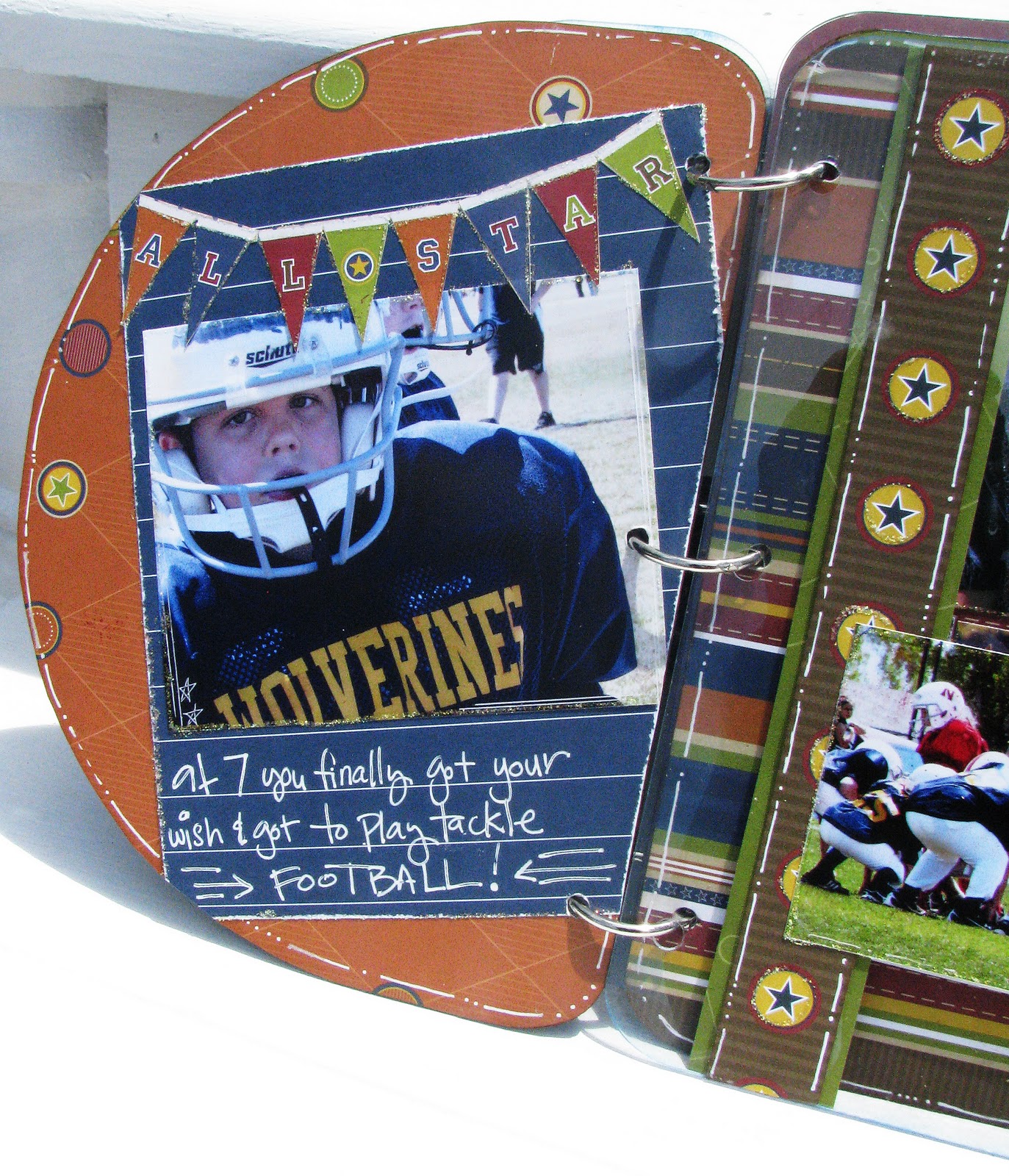 Hi guys, Rita here! This is a really cool size album I put together for my son who played his first year of football! I say first because he has been obsessed with football since he could talk and only wanted to play tackle football! He loves looking at these pics so I put them in this album for him. He loves it! The album is called "Sassy" and it's from Clear Scraps! Here are the pages…