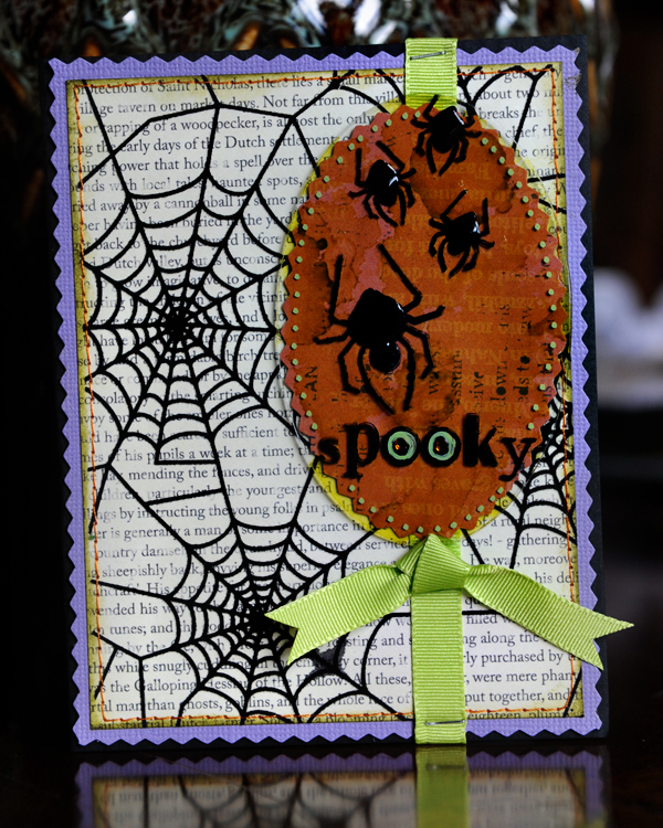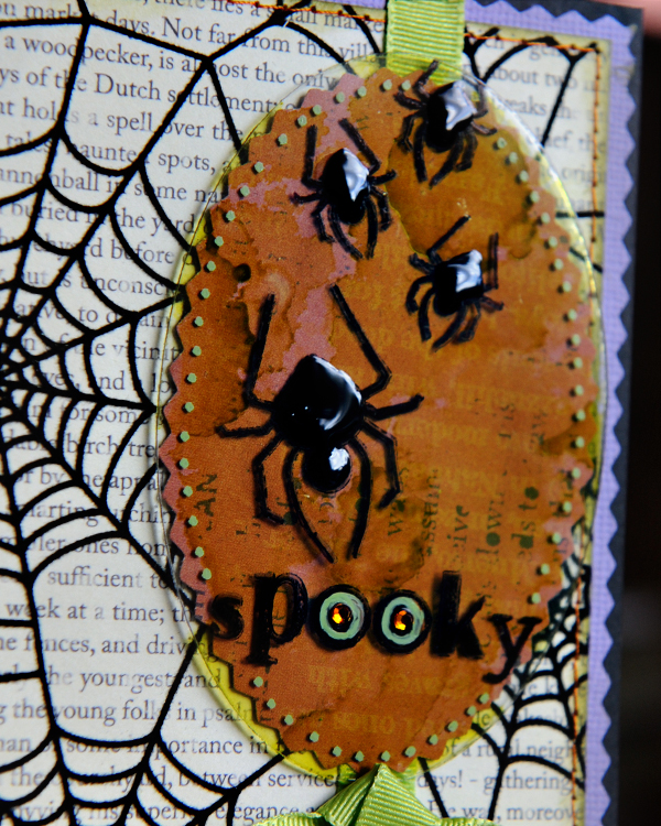 For this second card I used a green alcohol ink on the back of the acrylic piece and then backed it with a sheet of almost solid orange patterned paper. I then stamped the spiders on top using StazOn ink. Lastly, I added some of Rangers Enamel accents on top of the spiders bodies.
