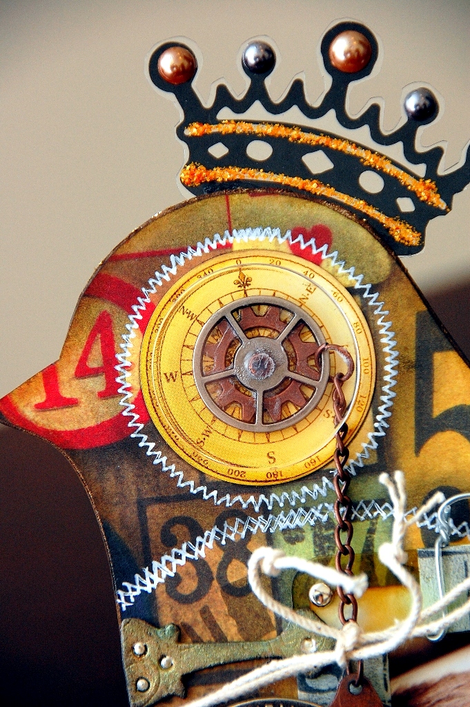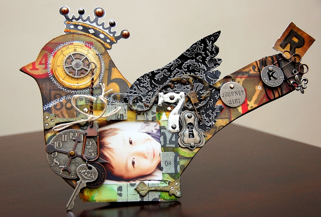 Are you all feeling inspired lately? If not, let me try to spark a little idea in you with the above altered project of mine. This is an altered bird that I've created using Clear Scraps chipboard XL bird. I've altered it into a frame. I've also used tons of Tim Holtz cool products on it.
