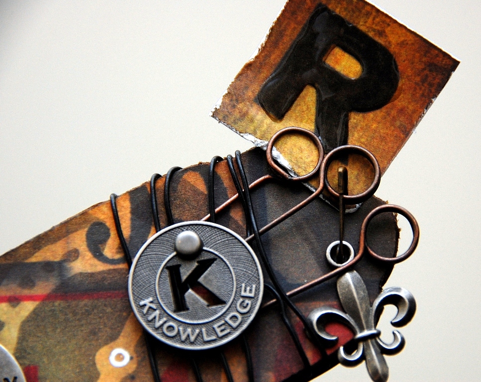 Supplies used: Clear products: Clear Scraps; Pattern Papers: Tim Holtz idea-ology; Inks: Ranger Distress Ink, Ranger Alcohol Ink; Chipboard: Clear Scraps; Metal Embellishment: Tim Holtz idea-ology; Stickers: Tim Holtz idea-ology; Mask: Tim Holtz idea-ology; Others: Ranger Distressed Stickles, Tim Holtz idea-ology fragment, tissue tape and grungeboard, Prima pearls, Inkssentials white gel pen, Ranger Glossy Accents, Ten Second Studio metal sheet, Tim Holtz Alterations, crafting wire. Adhesives: Zip Dry, Tombow and other adhesives.