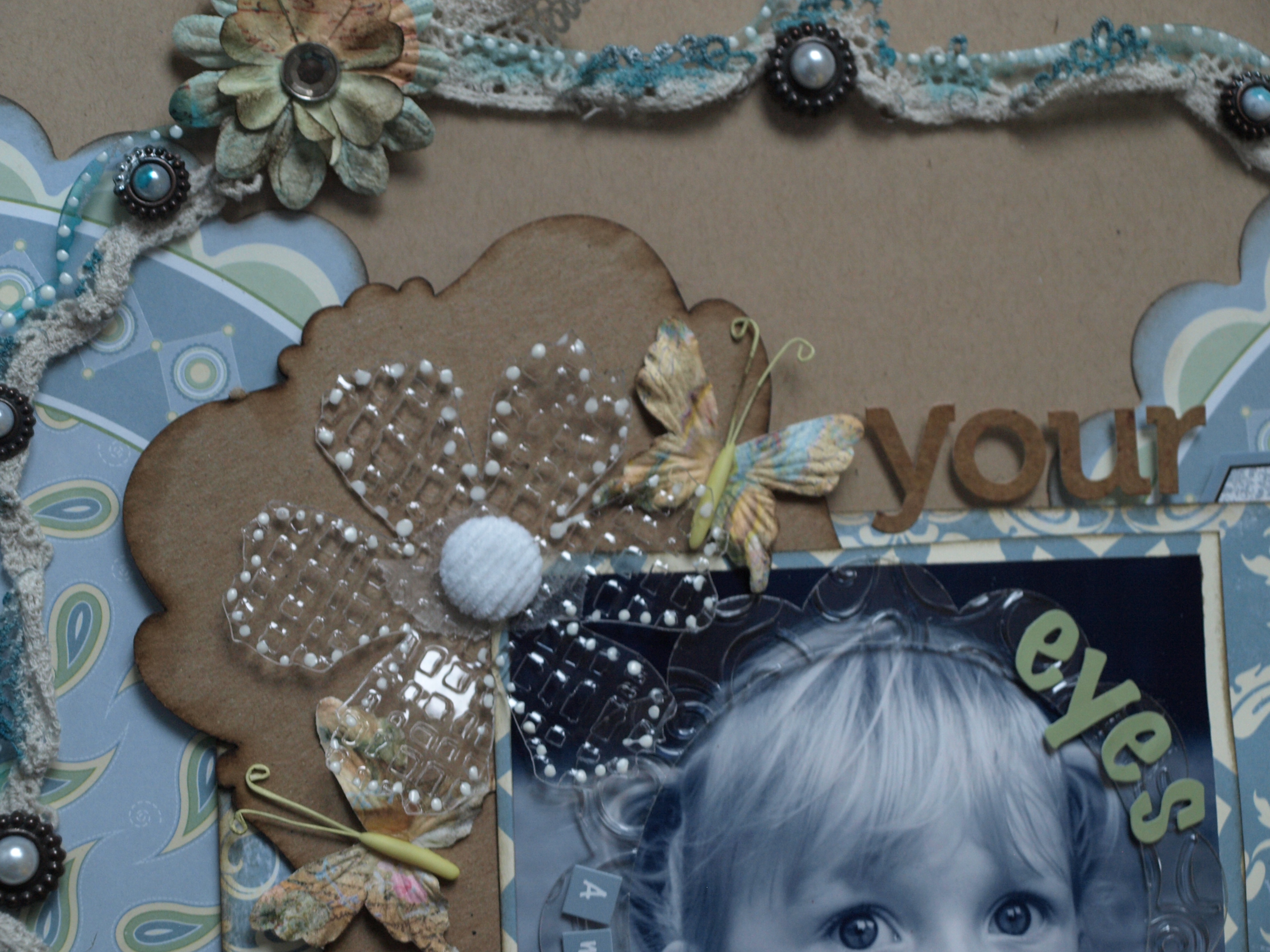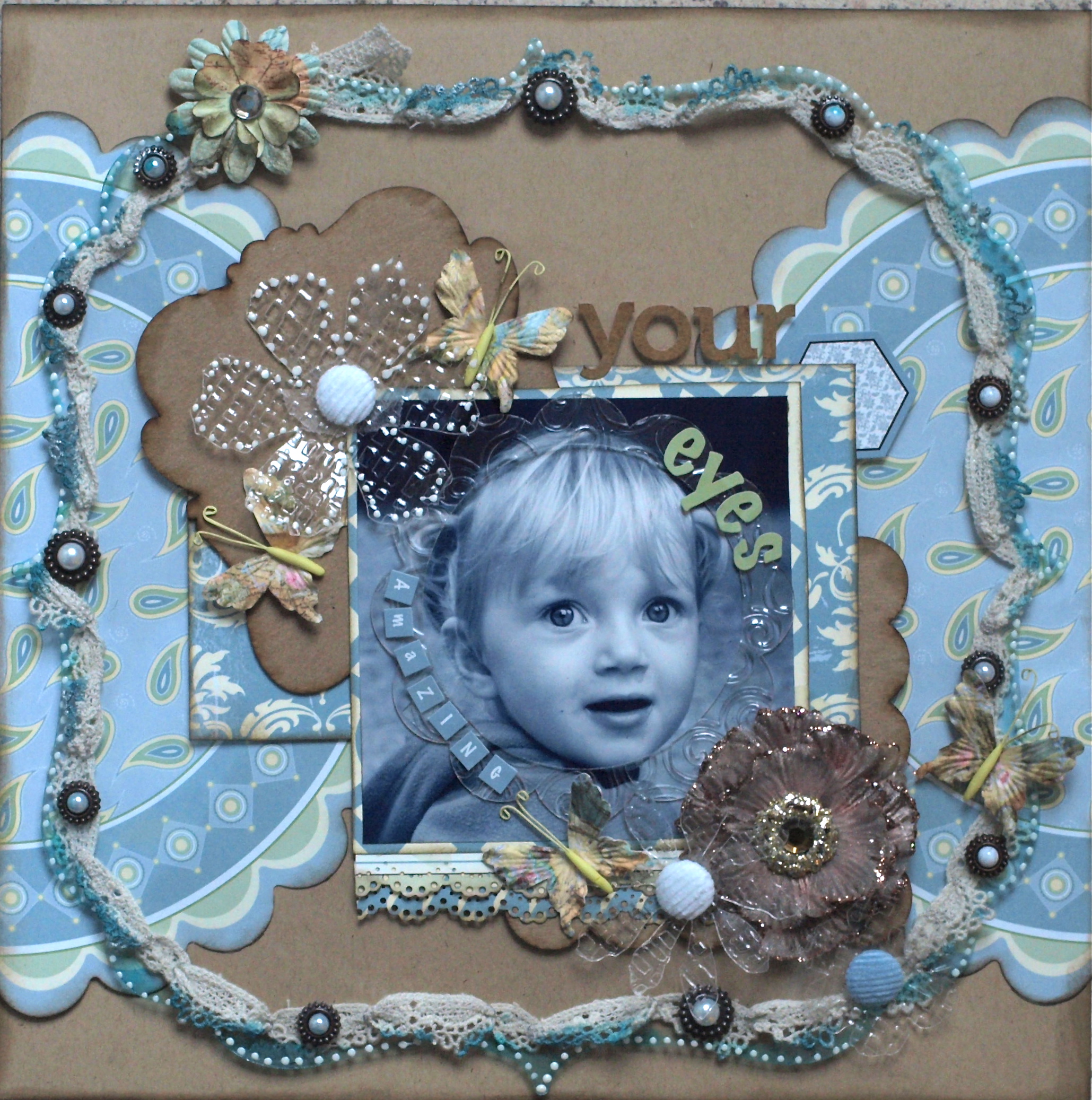 I used a XL Deco Sheet as a base on the kraft cardstock. I punched little holes around the corner of the entire sheet. I waved some lace through the holes and then added Tim Holtz ink around the entire sheet. When that was dry I added liquid pearls as a finishing touch.