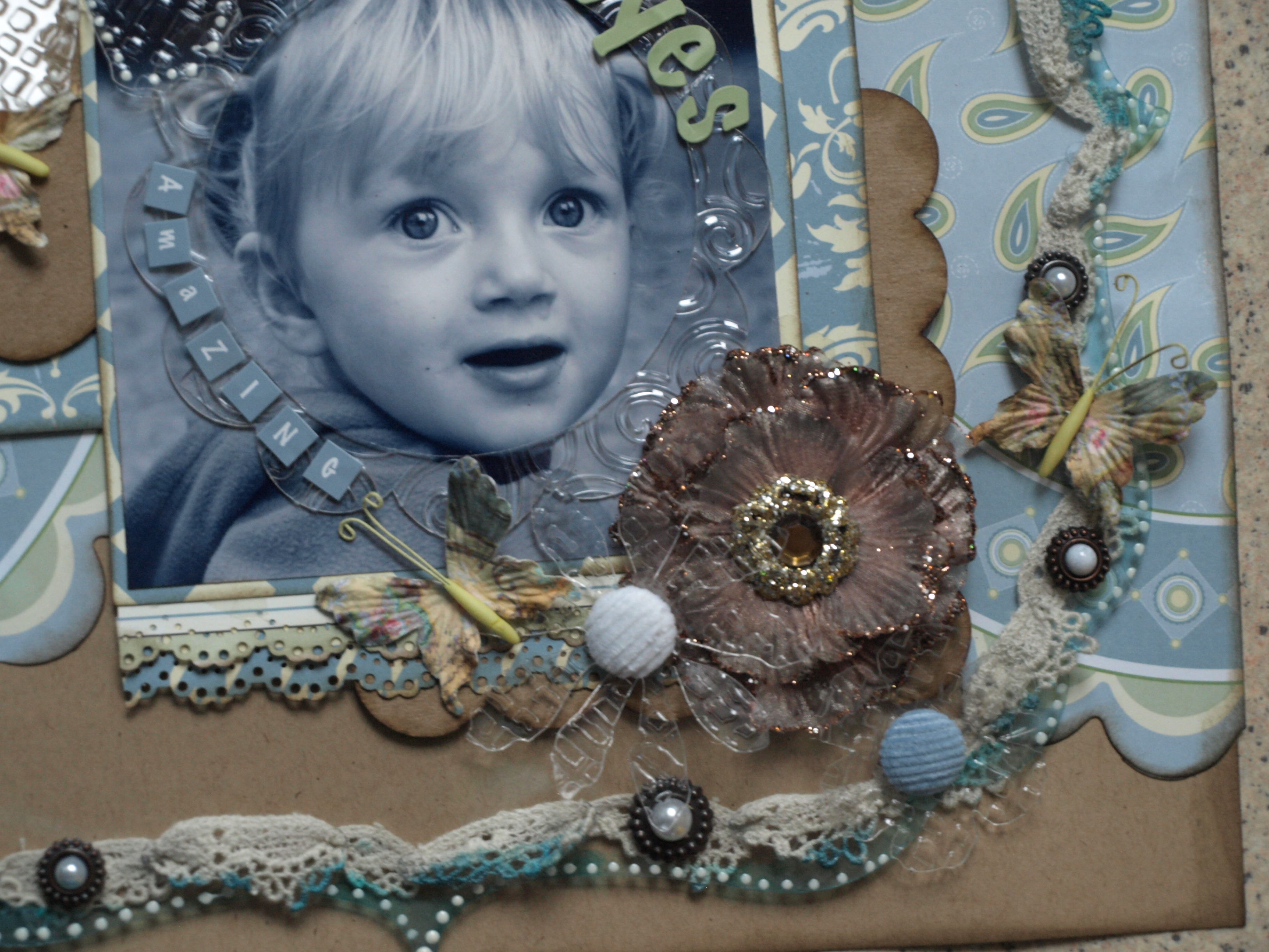 From a acrylic sheet I punched some flowers which I embossed with the Big Shot. They give some nice touches to the layout. The Vintage Chipboard Frames are also Clear Scraps. They have that darker frame of it's own…I love them! You do not even have to ink them!