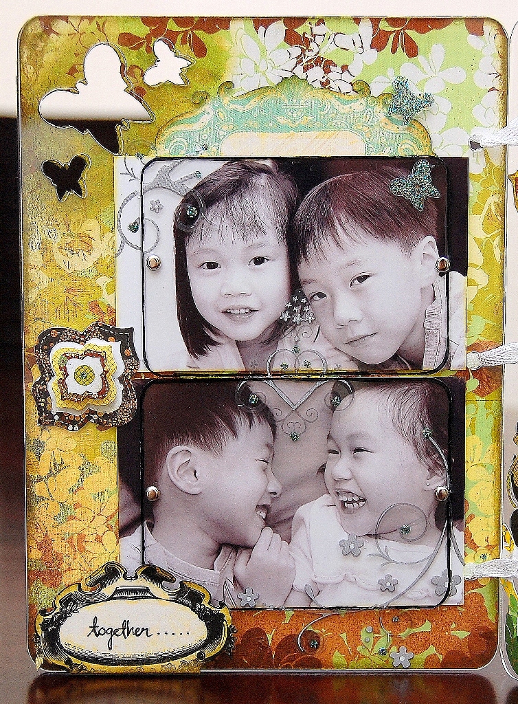 I've used some acrylic ATCs to cover the photographs and detail it with some rub-ons.