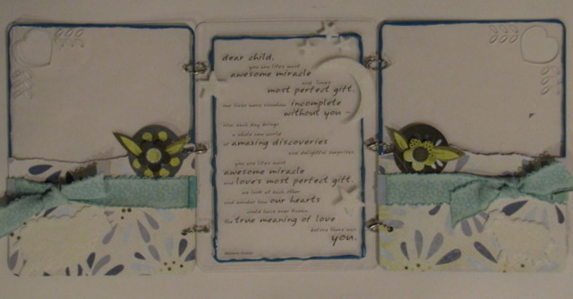 I have no idea where I got this very large vellum poem sticker from It Takes Two. I've had it in my stash forever…and never had the perfect place to use it until now. On the acrylic center of my tri-fold frame, it lets light through, or the colour of the wall behind whatever you set this frame on…and yet still is a lovely sentiment to go with 2 baby pictures – one on each side. This would be a lovely gift for an expectant mother. I've used Basic Grey paper, ripped on the top edges, ribbon from American Crafts and felt baby stickers from Martha Stewart to embellish the rest of the frame. The blue borders are gel paints from Viva Decor.