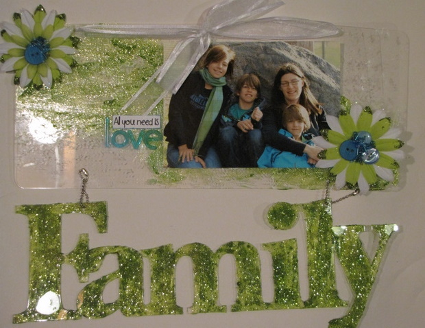 The second one I made, I changed it up a little and instead of layering the word on the frame, I punched holes in the word and hung it with chains underneath.
