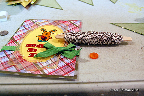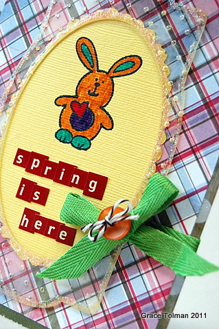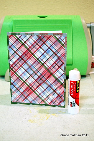 I used the pattern papers from Pink Paislee to cover the card. The plaid paper is 1/8" smaller than the card base to create the border from the green dot paper.