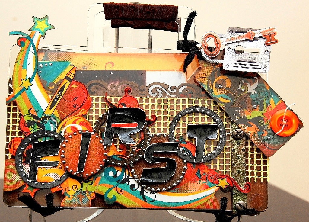 I've used the acrylic travel brag bag album by Clear Scraps to create this album. The "school zone" paper line by Moxxie is perfect for this album. Below are some details and pages in this album.