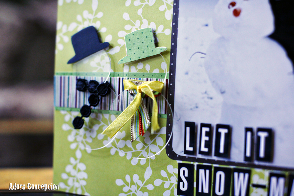 Spring has officially started but not quite in our neck of the woods, here in Seattle. 🙂  The winter cold air seems to linger a little bit more as usual.  So, to scrap this photo of my grandson with the snowman, feels just right.  I have to say I also couldn't resist to do this layout when I saw these  Clear Scraps Mini Snowman and Mini Snowflakes,  they are the cutest. It's a great mini album but I used it to embellished this page . I really did very little in embellishing these cuties. I wanted it more to be simple and so I simply dress them up. Yup, made a little hat and scarf so easy and fast, and yet so adorable. I think 🙂