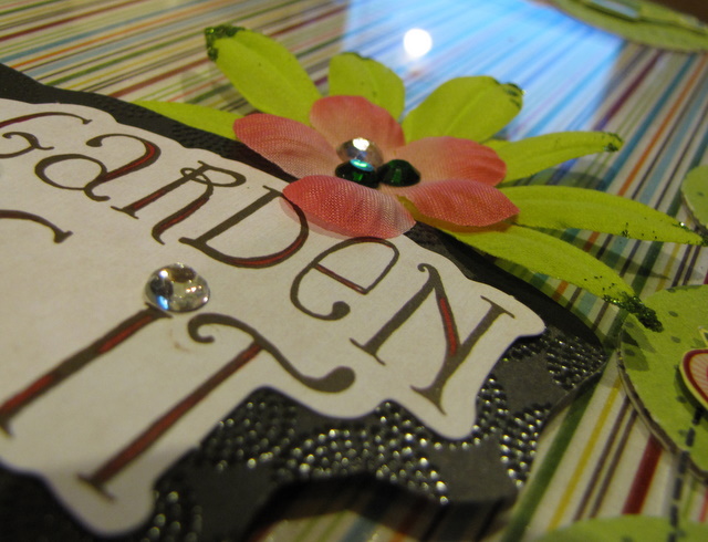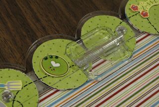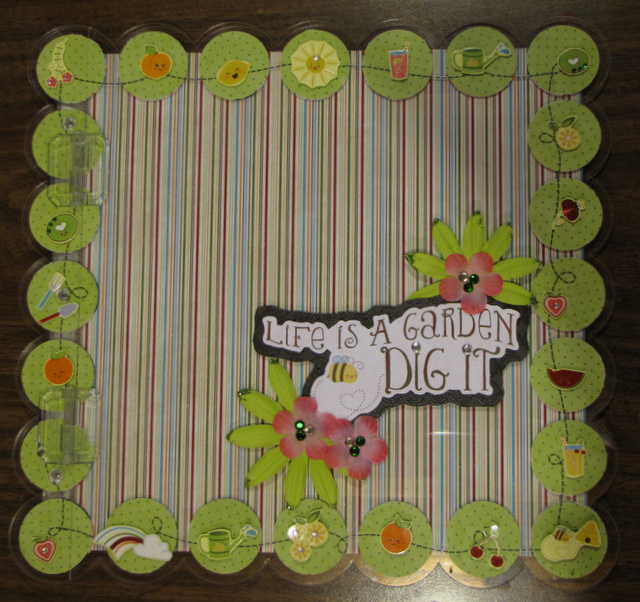 I have one more leftover Imaginisce project to share with you today….using one of our brand new 12×12 acrylic Top-Load albums that are Now Shipping!! For my project I chose the Scallop Top-Load album and to emphasize the scallopped edge, I punched a whole bunch of circles out of the Imaginisce patterned paper and fussy cut a small fruit/garden character to go on each circle. My vision for this album is that it will be a book of memories we'll make this summer. I kept the front very simple with a sheet of paper behind it and some flowers, some jewels (adhered with the fabulous iRock) and a matted die cut title.