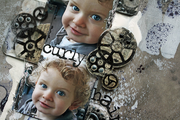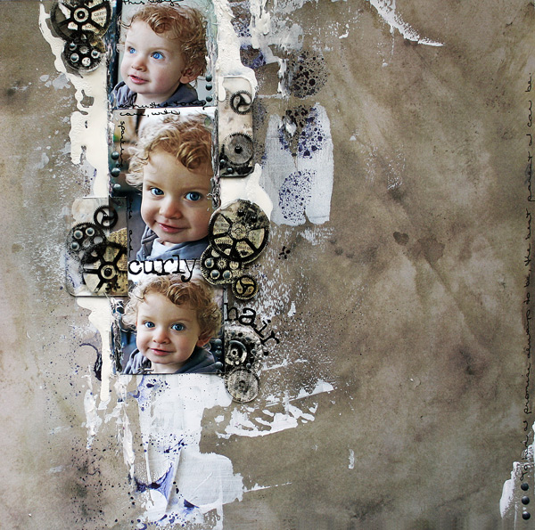 Ever since I gave birth to my son, my scrapping style has been sent into a tizzy. See, I have two older daughters that my entire crafting style has been centered around for years. Flowers, flourish-y, feminine, whimsical, beauty with a bit of grunge. Yep, that is what has been "ME" for a long time. But, then Jax showed his curly and adorably boy face, and I am still trying to work out what that means for me and my style because I love adding layers and embellishments that I make myself… but I don't want his pages to look just like his sisters'.