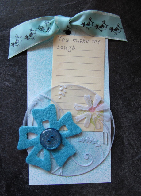 The white office-supply tag is spritzed with Glimmer Mist, the circle of acrylic has been run through my Cuttlebug and then the raised portions sanded to make them translucent, not transparent (my son is in the middle of a Gr. 4 Science unit on light). It still shows the colours of the tag from below this way but the raised flowers are whitish and cloudy. I stapled it onto my tag (yes, a regular old stapler) and added a flower and button.