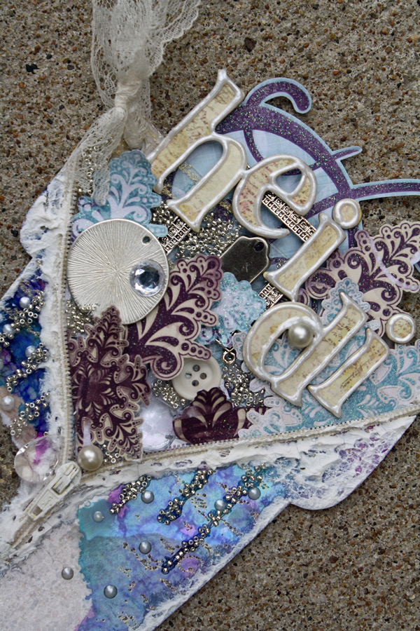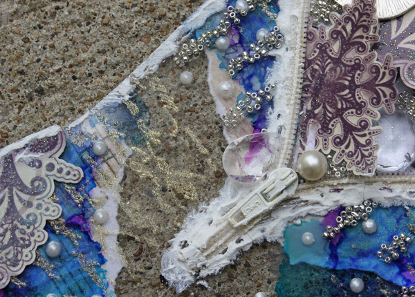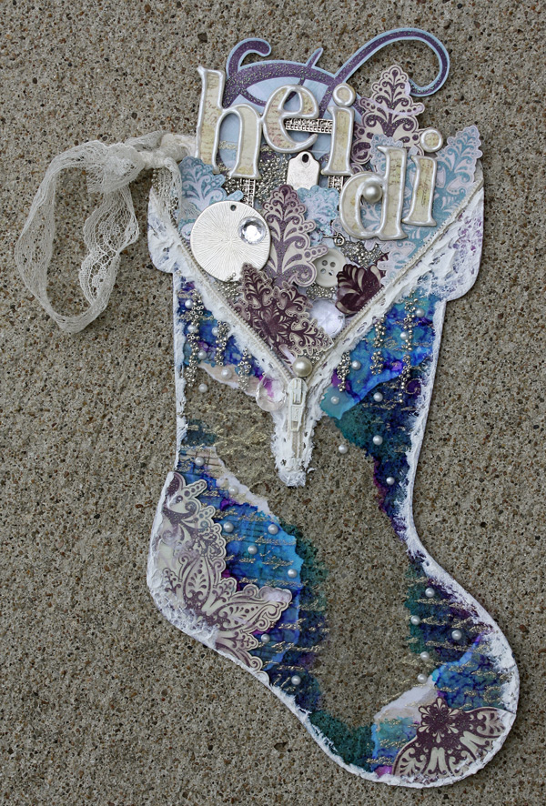 I "filled" my stocking to the brim with all things snowy and beautiful, added pearls and beads, and accented with my pearl pen. The color scheme… while maybe not Christmas-y, definitely was a cool enough winter palette, loaded with lots of alcohol inks to really make the acrylic shine!