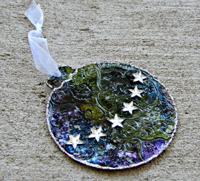 Here I started using the same techniques as above, but did not add the Pearl paint daubber – you can tell this on is more translucent. ( I used alcohol inks in blues, greens and silver metallic.) I added little stars with Zip Dry and edged the shape with silver Stickles.