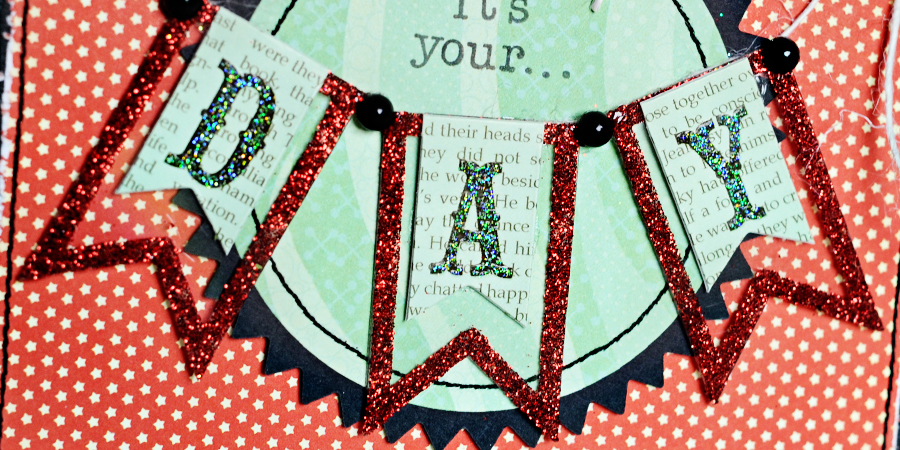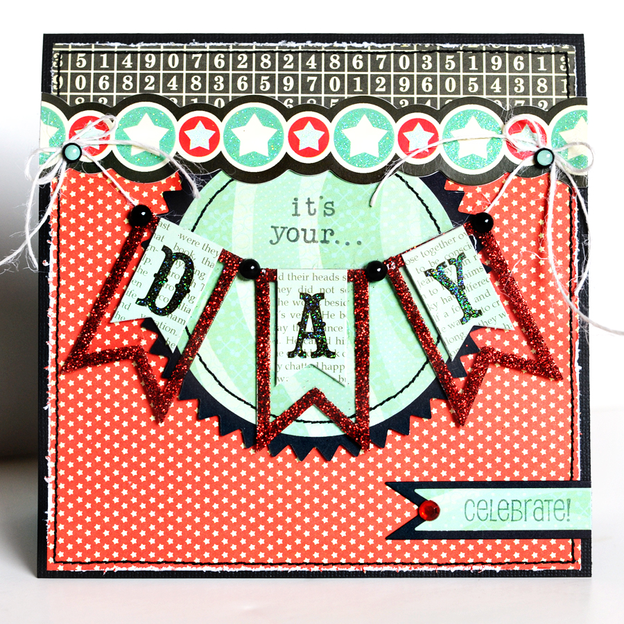 A perfect pair…Clear Scraps and Pink Paislee ( in particular Collage Press for Pink Paislee) Hometown Summer papers and embellishments. For this fun birthday card I used the brand spanking new Clear Scraps Pennant Embellishments. To decorate these little pennants pieces I used Scor-Tape (1/8") to adhere glitter to the edges of each of the pieces.
