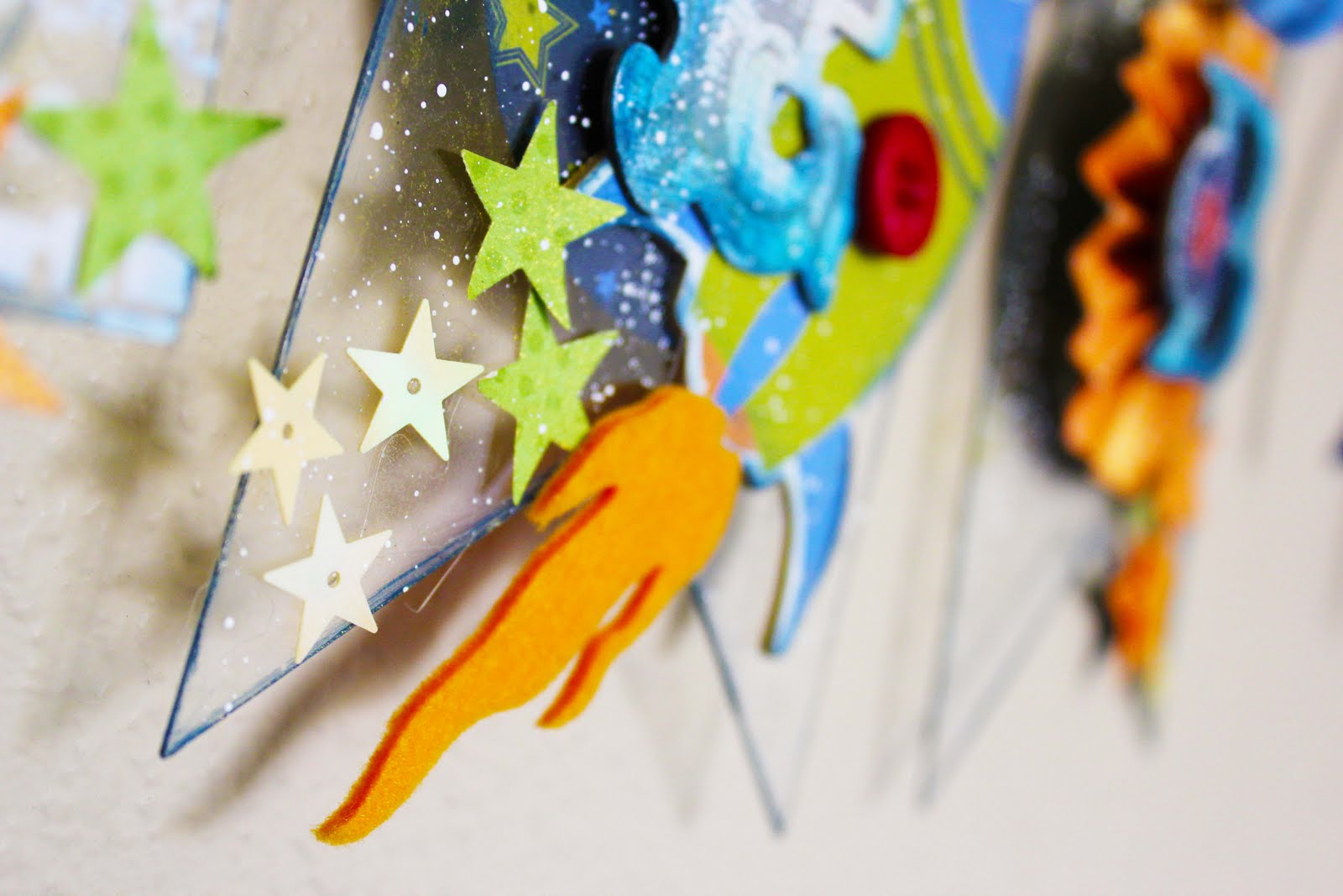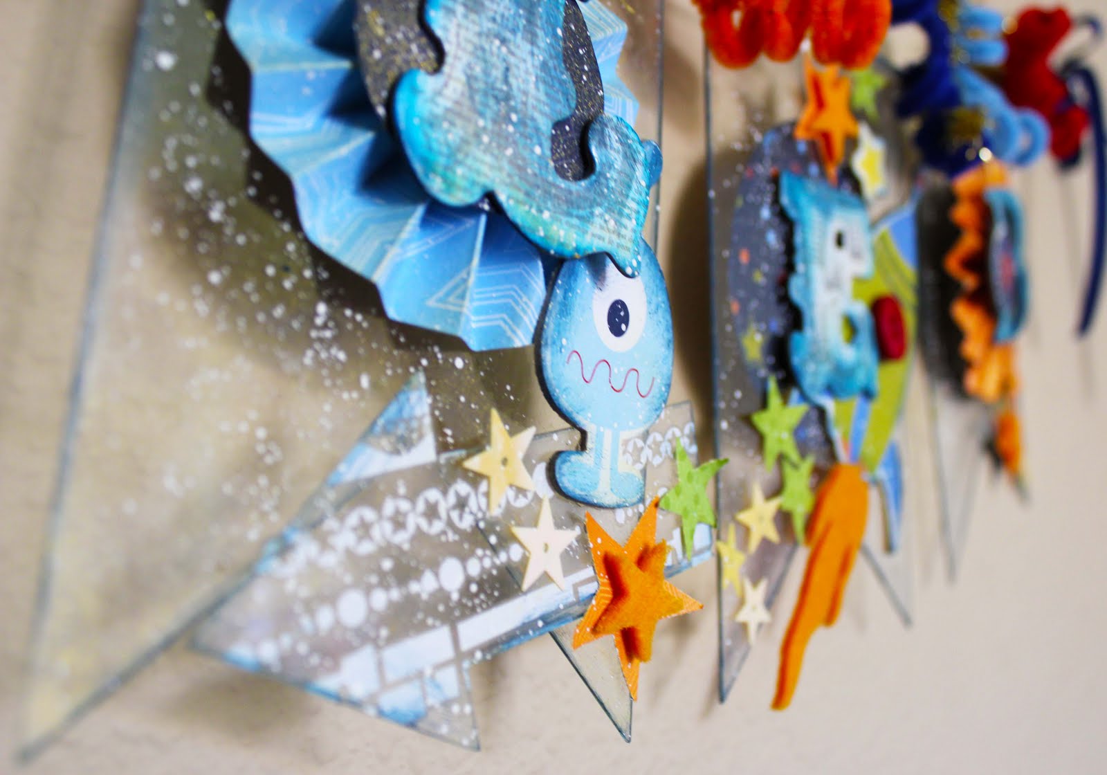 I hooked the pages together with brass rings and tied loads of ribbon and chenille stems onto them. I layered on punched circles, felt accents, chipboard stickers, and buttons — so love chunky full layers on projects!! I added rub-ons to two acrylic arrows to make them stand out from the acrylic pennants as accents. I inked the diecut chipboard letters by Pink Paislee with ColorBox Fluid Chalk Ink to make them match the papers I used. I sprayed the acrylic pennants with Smooch Spritz, painted them, inked them, and then splattered them with more acrylic paint. I had a blast!!!