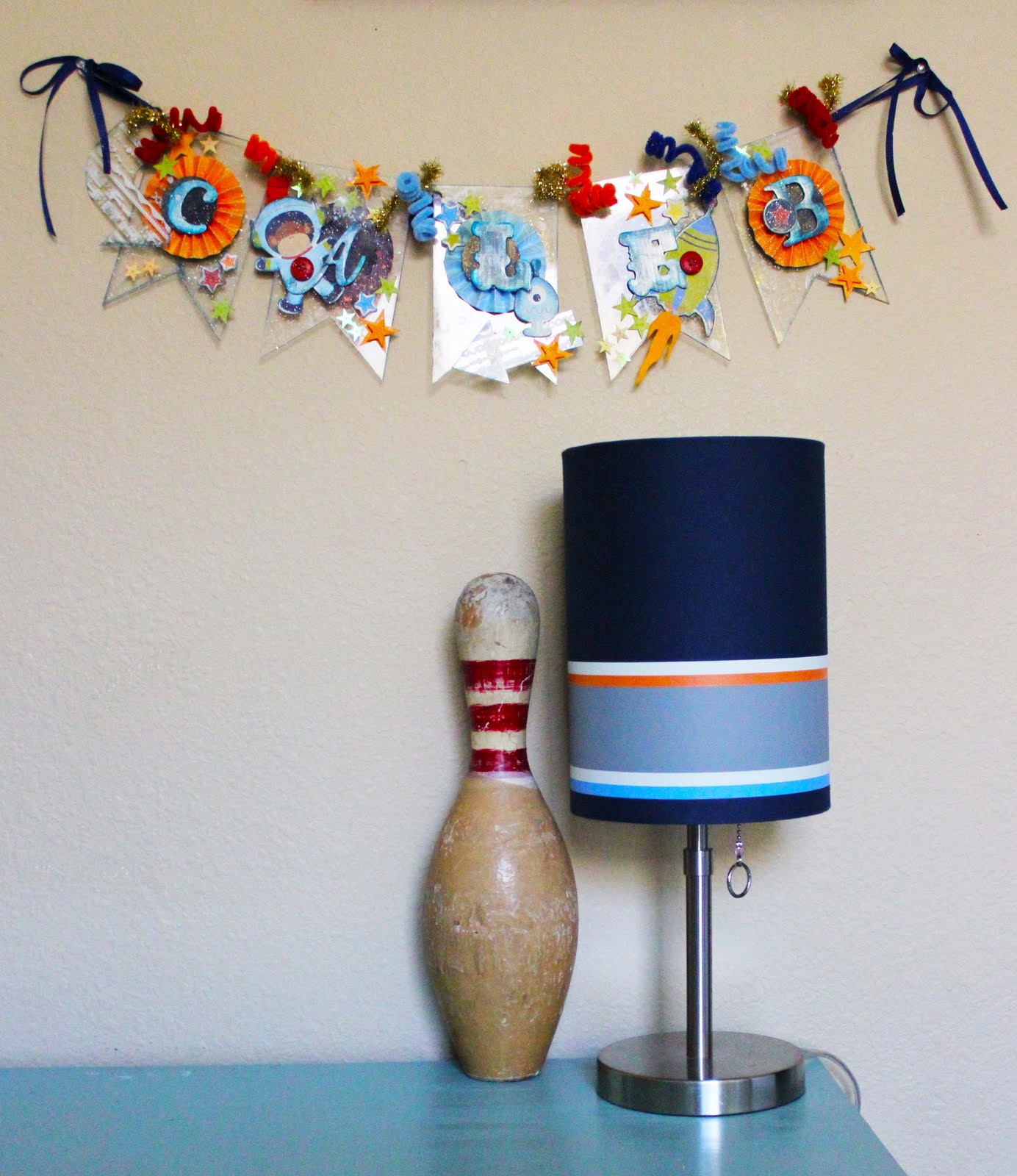 I decided to make a little banner to hang above his crib using some Clear Scraps Mini Banner pages from one of their mini books. I had so much fun creating this banner!!!