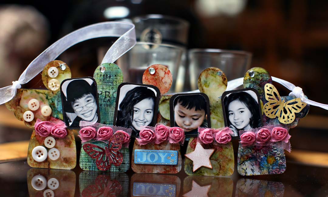 I made it into a wall hanging with of course photos of these little people, they are my scrapbook subject, my son, grandson and my nieces! Again, I used alcohol ink on this project. it reminds me of the stained windows you see at churches. 🙂 I stamped the inked acrylic and added some embellishments. I attached the angel together as shown with a terrifically tacky tape.