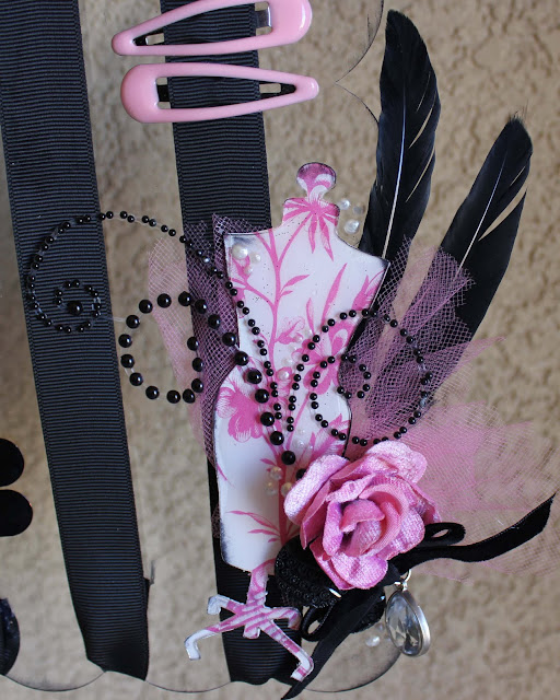 For the focal point on the lower right side of the holder I added feathers, bows, stick pins and baubles. I covered the back of the one of the Dress Forms Embellishments by Clear Scraps with Anna Griffin paper and then cut it out with a craft knife, inking the edges with black ink. I added that to the grouping of embellishments and added a Prima pearl flourish on top to bring it all together. Now it's ready to hang and store barrettes and hair clips!