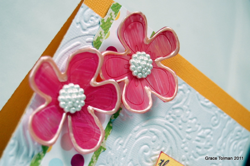 and then I ran some Clear Scraps acrylic sheets through my die cut machine using a flower die from Sizzix. It didn't cut all the way through but I love how the die made some deep impression that when I painted the backsides of the flowers, I showed the texture and impressions. I also added some Viva Decor liquid pearls on the edges for a finished look.