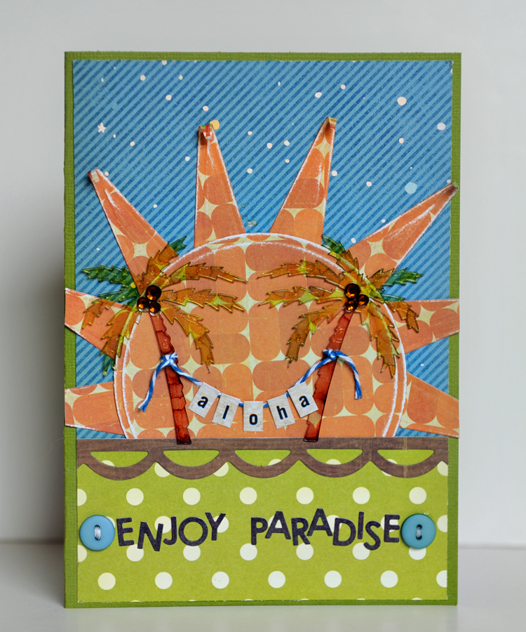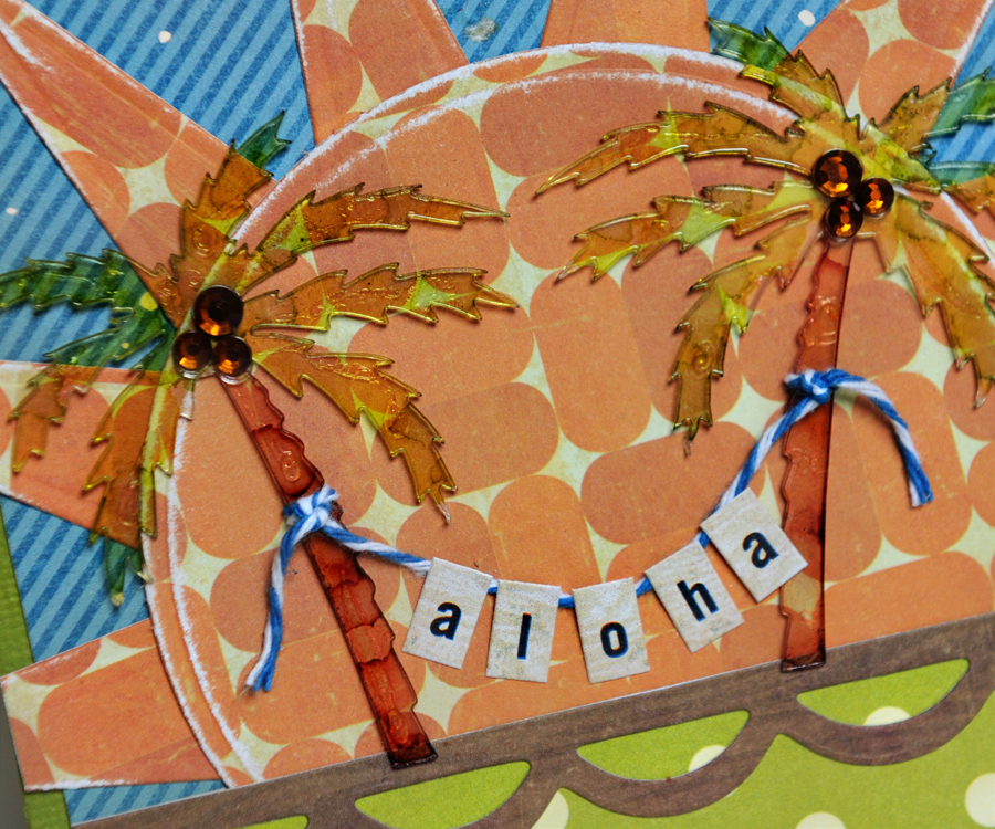 Well, our weather here has decided to change from near 100 degress to the 70’s this last week. Makes me long for a vacation to somewhere warm and sunny (throw in a pina colada and cute pool boy too!). Thus, the inspiration for my card. I started with a the Travel embellishments (all links below), snagged the two palm trees out of the pack and some alcohol ink. Embellished the with some brown jewels to make coconuts and then put the card together.