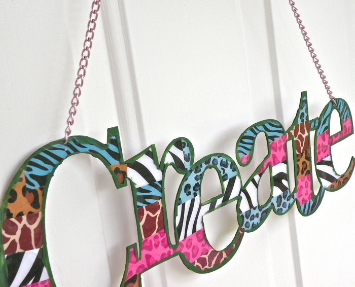 I created this one for my scrap room. I simply used a punch to create 2 holes, then added a PINK chain. To create the animal print look I coated the back of the Expression with Mod Podge,