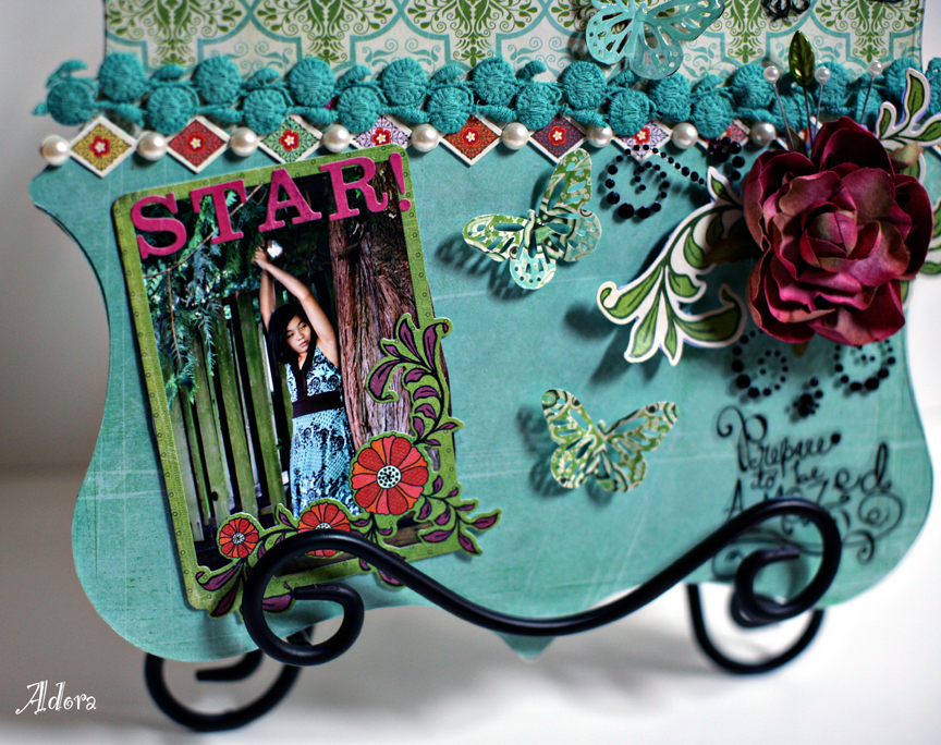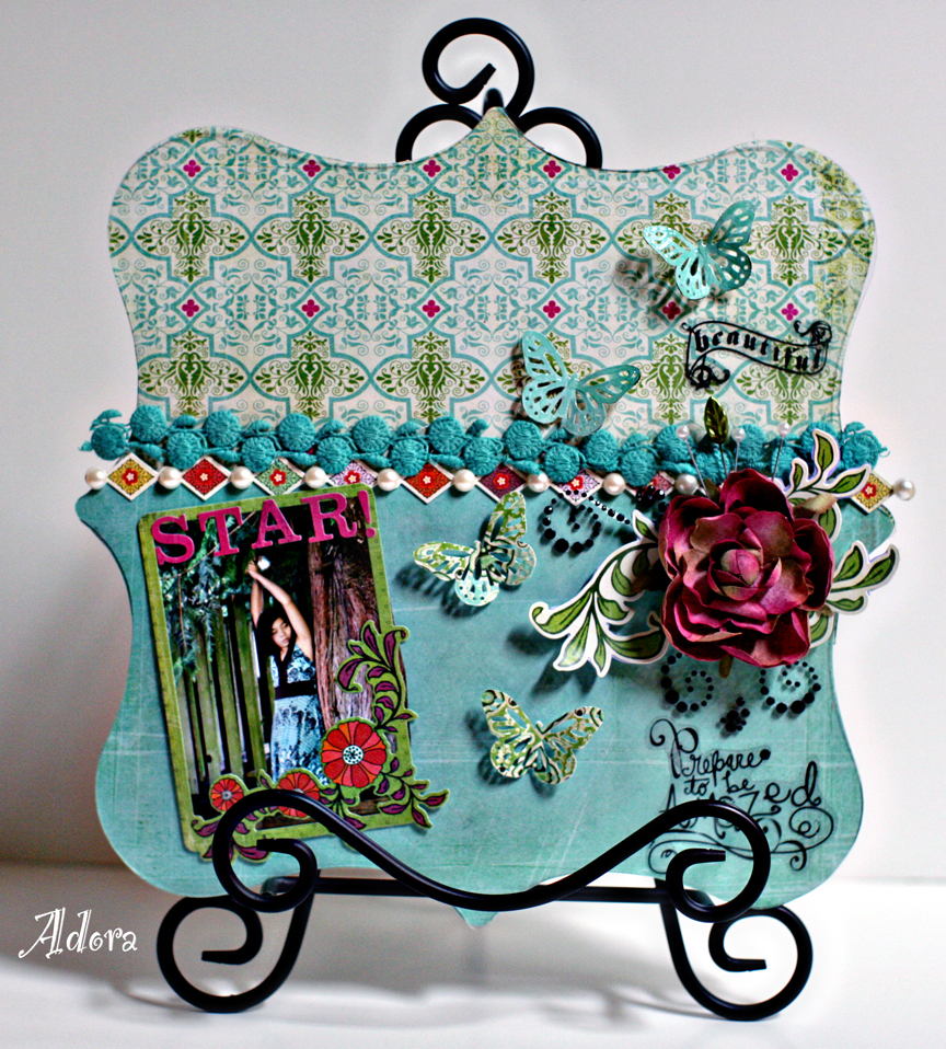 One of the many reasons I love acrylics is that it gives my project a polished look. 🙂 I just  love the glossy look of the paper under the acrylics, not to mention the so  many shapes  it comes with.! So much fun!  Other supplies I used  are;  The beautiful Basic Grey, Indie Bloom Paper Line; Prima flowers and ribbons; Recollection Bling; Autumn Leaves Stamps; and Martha Stewart butterfly punch.