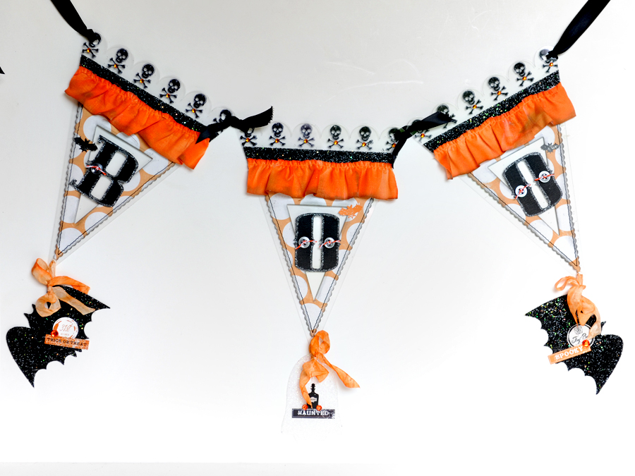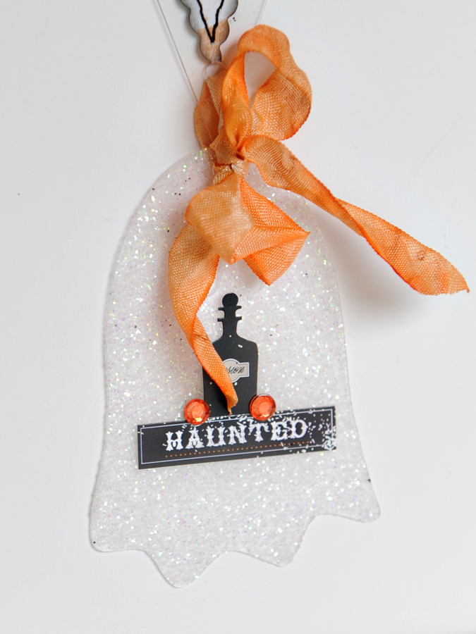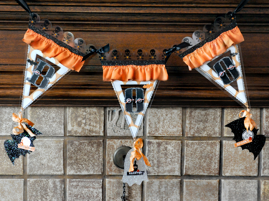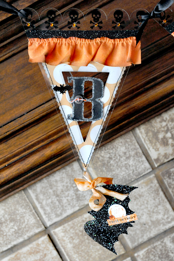 Look closely and you can see the bats and ghost that are hanging off of the ends of each banner piece. On those acrylic pieces I simply covered them with Modge Podge and then before it dried I sprinkled them with glitter.