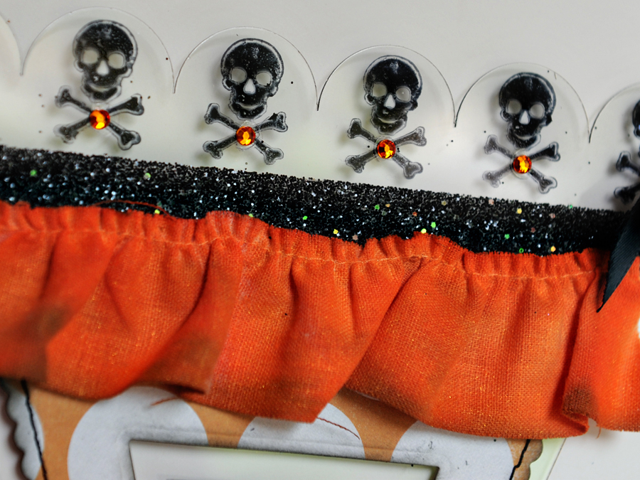 The orange ruffles are the Mistables canvas ruffles by Pink Paislee and I misted them with a Sparkly orange and black mist. The skulls and crossbones were stamped on using black Staz On ink.