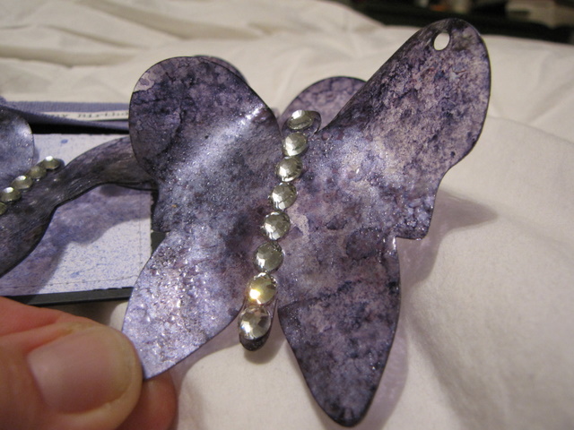 On these butterflies from the Mini Butterfly Album, I first used Eggplant alcohol ink and then a quick spray of Goosebumps. When they were dry, I used a heat gun to soften and curl up the edges of the butterflies' wings. I love how the light reflects off all the glossy bumps from the Goosebumps.