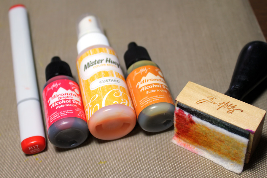Grab your Alcohol ink applicator and put a couple drops of Watermelon & Butterscotch alcohol on the applicator. Unscrew the Mister Huey Custard and drop a couple of drops of that color near the butterscotch.