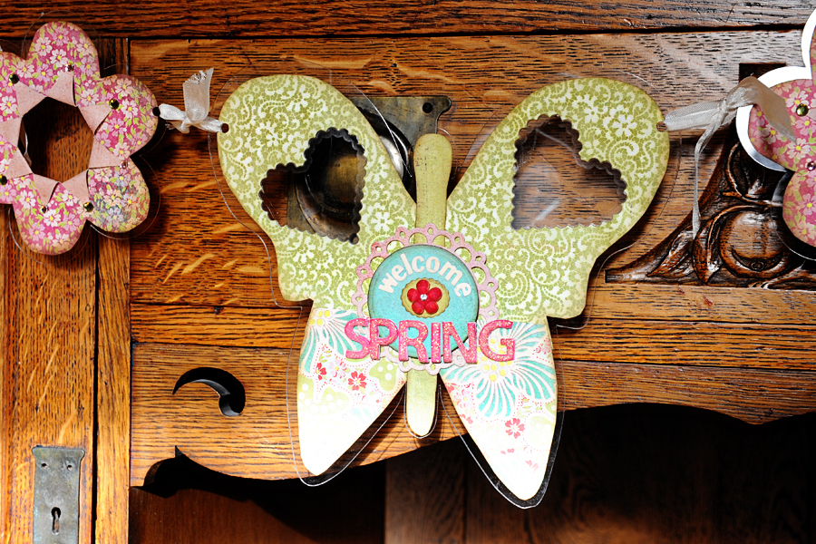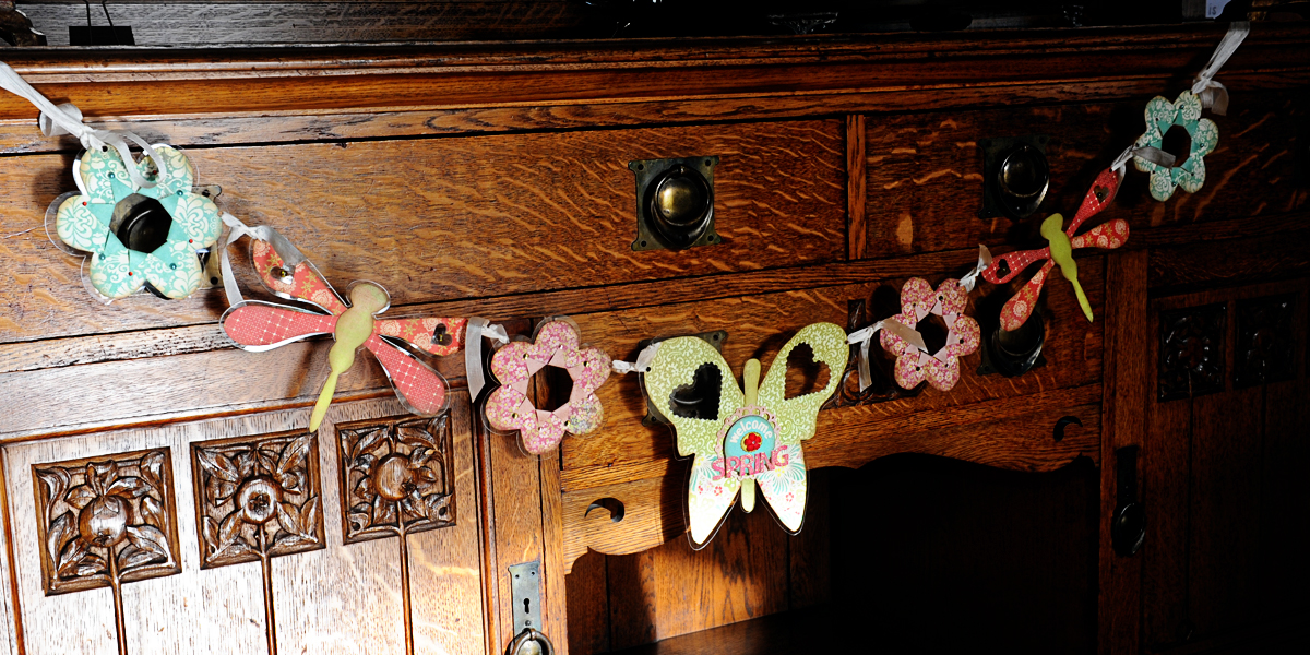 Today I am sharing with you a cute little spring project. This was the BUTTERFLY BANNER that I made for the Clear Scraps booth for CHA. Let me apologize for the not so great photos. This was one of those made in a time crunch projects and I had only one afternoon to get it photographed and sent off in the mail. Lighting wasn't optimal, but here it is regardless.