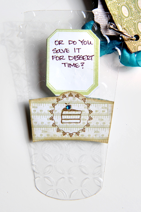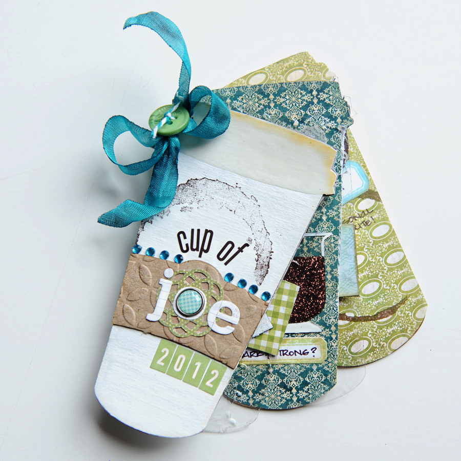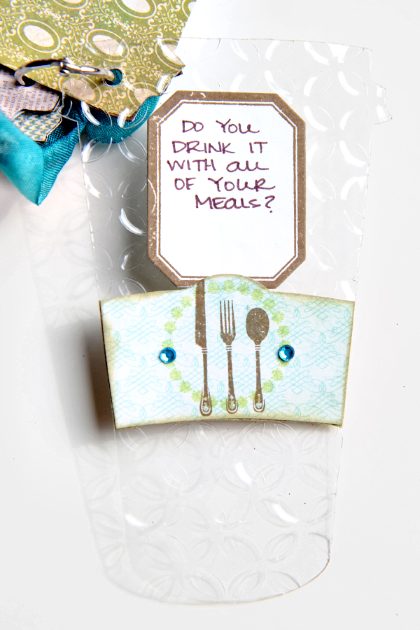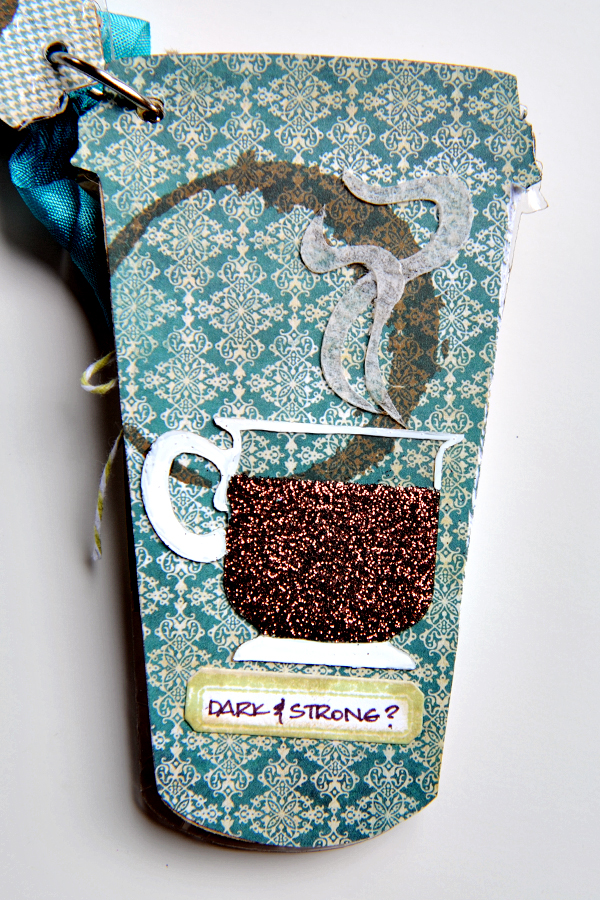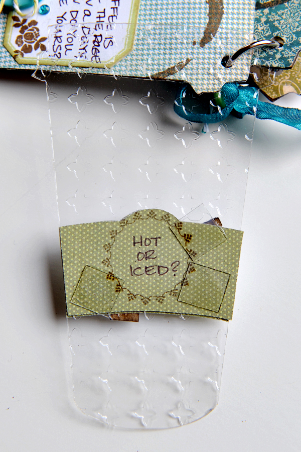 For the cover I simply painted the cup white and then to get the effect of a plastic lid I just covered that portion of the cup with Glossy Accents. The chipboard coffee cozy was embossed with an embossing folder.