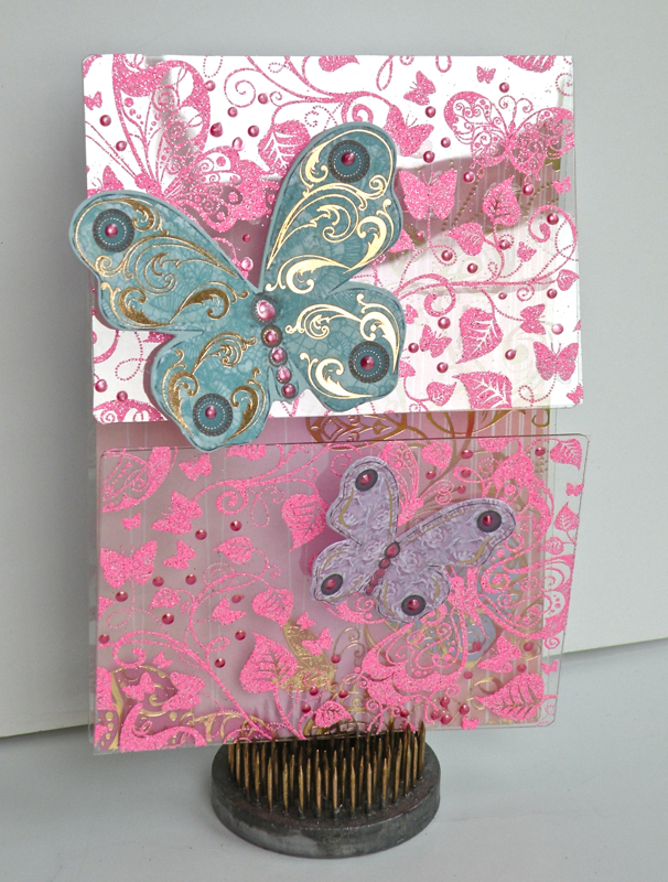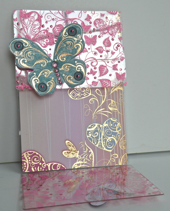 With spring finally here I am so ready to play with spring colors and make spring themed cards. I love the light and delicate feel/look of the Send It Clear Cards for this card I used the Regular Send It Clear Card and on the outer flaps I use acetate glitter paper. Perfect for that special touch.