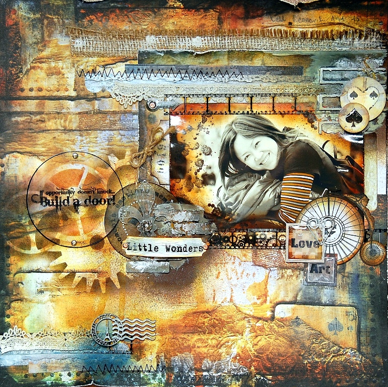 Hi everyone! Today I would like to share with you all a mixed media layout which I've created using a Clear Scraps acrylic circle and fleu-d-lis. I've used 7 Dots Studio artsy paper line, Wonderland, to create this layout.