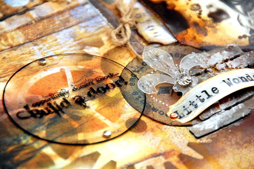 Acrylic Products: Clear Scraps; Pattern Papers and Stickers: 7 Dots Studio; Inks: Ranger Inks, Tsukineko; Stamps: Vilda Stamps; Chipboard: Dusty Attic; Adhesives: Beacon