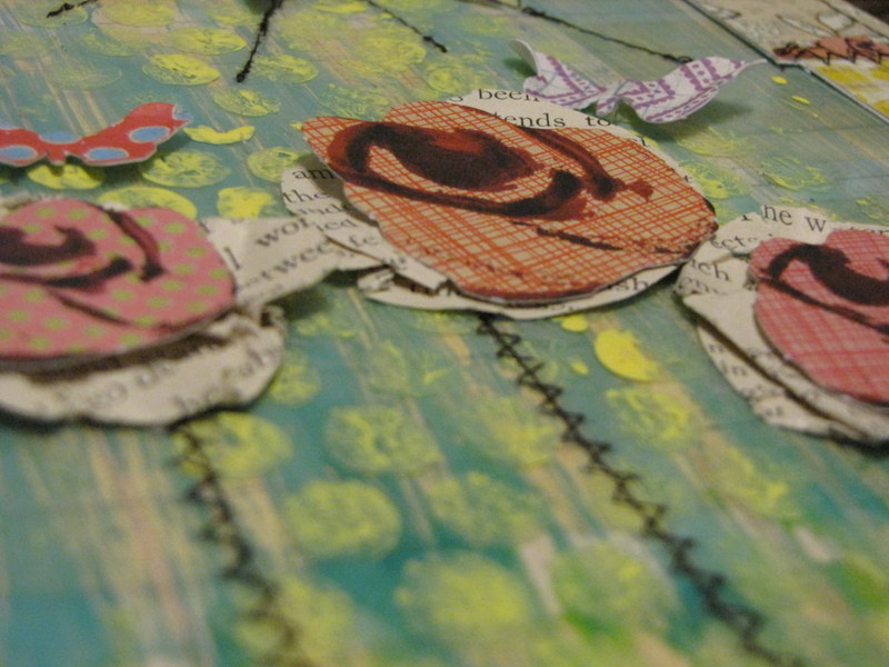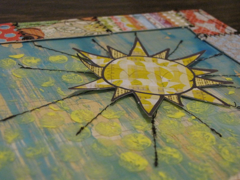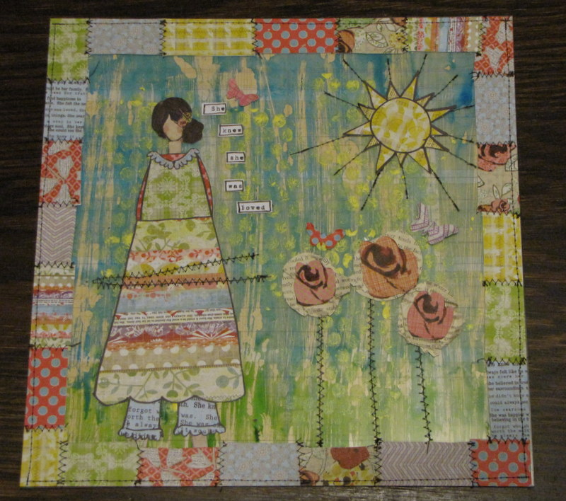 and 2.) With acrlic….I can SEW on it. I love the look of stitched layouts and this She-Art line lends itself perfectly to a little extra sewing. On a canvas you're pretty much relegated to doodling and rub-on stitches instead of the real thing. But on my acrylic layout, even with 2 sides painted and patterned paper below and on top, I could stitch through it with no trouble at all. I stitched the whole border of the layout, the sun's rays, the stems on the flowers and a little across her dress.