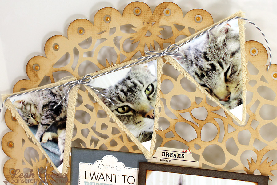 I used my Cameo Silhouette to create the beautiful doily background, then I adhered it to the 12×12 acylic sheet. From there, I built up the layers of the layout by adding close ups of this sweet cat of ours in the banner.