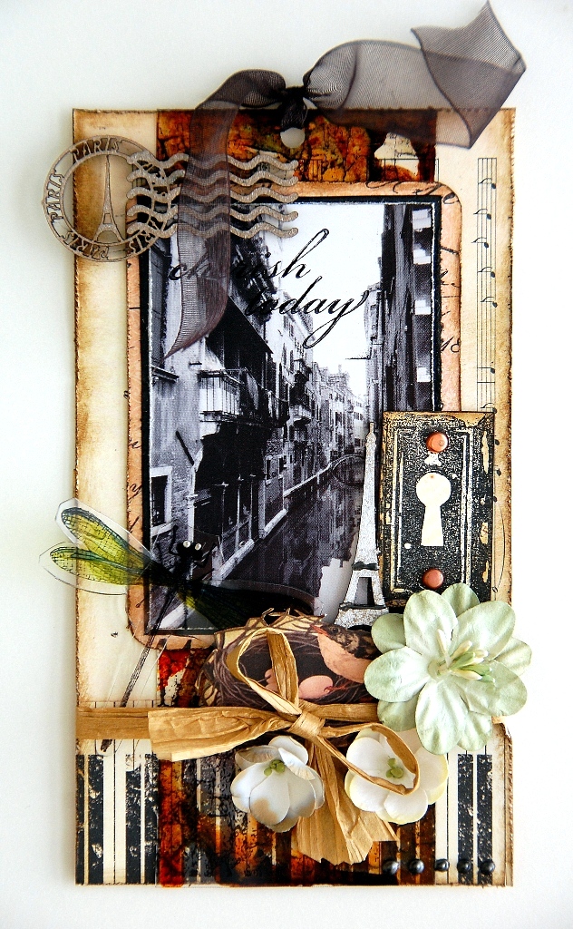 When it's dry, attach the acrylic piece onto a piece of pattern paper. Preferably a light tone pattern paper such as beige or white. I've also stamped the dragonfly onto the acrylic sheet and cut it out to create the dimensional dragonfly on the tag. I've colored it with Copic markers first.