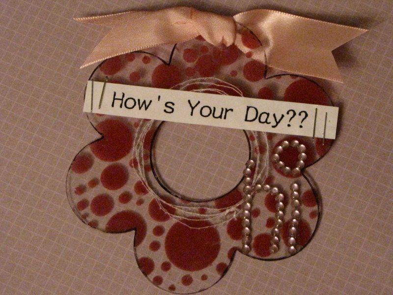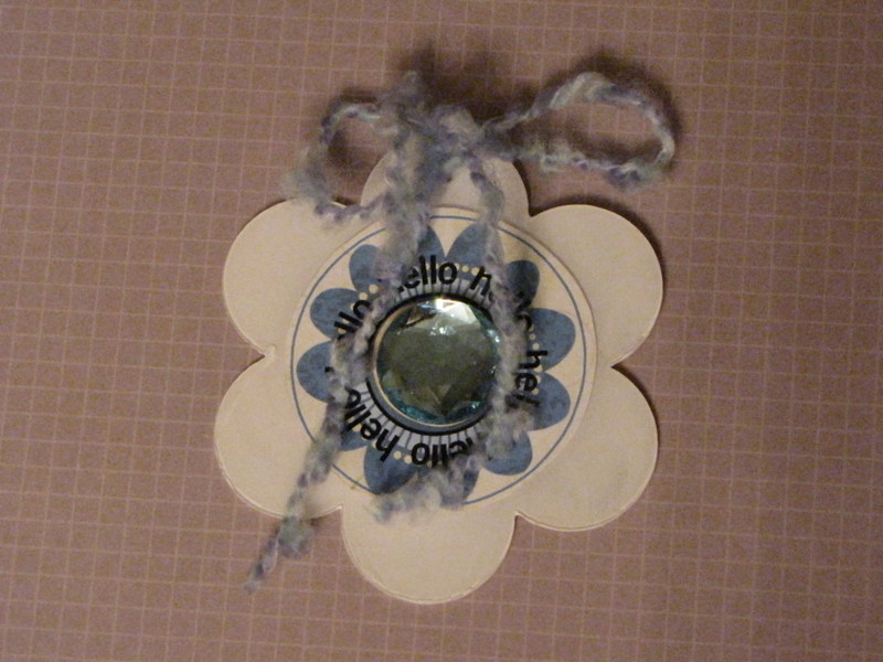 On this acrylic flower "Hello" tag, I painted the back of it, added a circle of patterned paper with a sentiment rub-on, attached the paper with a brad and tied it with fibers. Done.